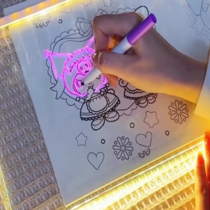 Medium size luminous drawing board (20*20cm) + stand + 5 colored pens + erasable cloth + copy paper